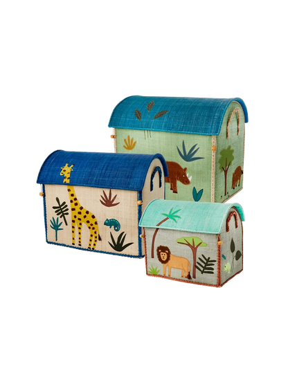 Zestaw trzech pięknych koszy z rafii z uroczymi haftami to idealny dodatek do przechowywania zabawek w dziecięcym pokoju. Poza tym, że są urocze i praktyczne, są również ręcznie robione z liści palmowych na Madagaskarze – dzięki czemu dwa produkty nigdy nie będą takie same, co naszym zdaniem jest częścią ich uroku.